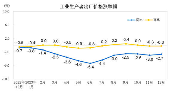 2023年12月份,全国工业生产者出厂价格同比下降2.7%,环比下降0.3%;工业生产者购进价格同比下降3.8%,环比下降0.2%。2023年全年,工业生产者出厂价格比上年下降3.0%,工业生产者购进价格下降3.6%。